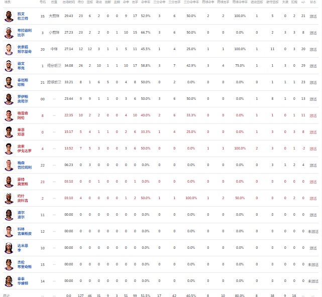 菲尼克斯太阳德文-布克26分2板10助1断1帽,比尔23分2板2助1帽,杜兰特23分6板2助;