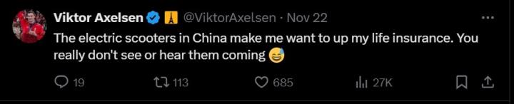 安赛龙社媒发文:中国的电动车让我想要提高我的人寿保险mljjywh4115 @懂球帝2024-11-27 16:30北京时间11月22日,羽毛球奥运冠军安赛龙在社交媒体平台发文提到中国电动车的问题。安赛龙表示:“中国的电动车让我想要提高我的人寿保险(保额),你真的看不到也听不到它们(电动车)的出现。”据了解,当时安赛龙正在中国深圳参加中国羽毛球大师赛。公开资料显示,本届中国羽毛球大师赛安赛龙半决赛与丹麦队友安东森相遇。最终双方鏖战80分钟,安赛龙以1-2遭对手逆转,遗憾无缘决赛。展开更多