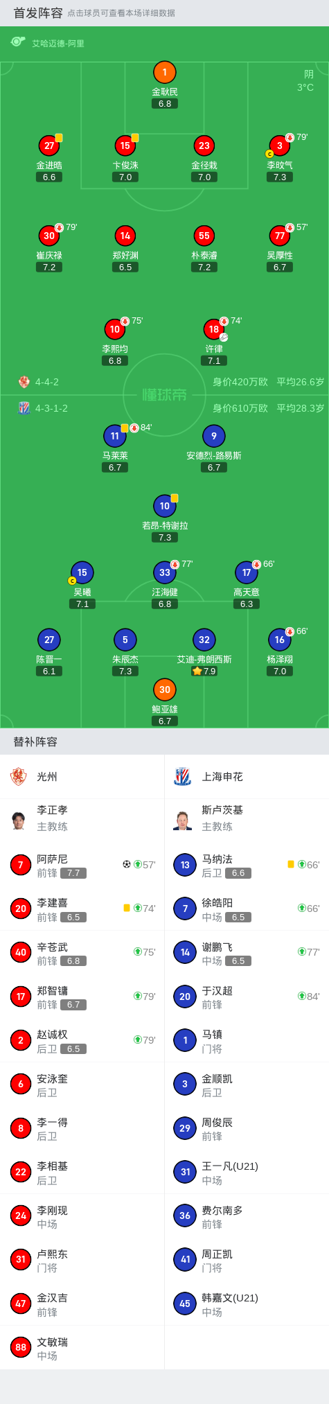 申花客场0-1光州,阿萨尼替补登场闪电破门,申花仅2次射正