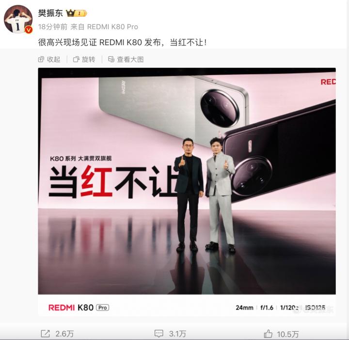 樊振东现身红米K80发布会与王腾合影,并挑战用一句话发微博爱看体育的小溜 @懂球帝2024-11-27 20:40北京时间11月27日晚,乒乓球大满贯樊振东现身红米K80发布会。在发布会上樊振东与REDMI品牌总经理王腾一同见证K80大满贯时刻,并挑战用K80Pro的超级小爱功能一句话发微博:很高兴现场见证 REDMI K80 发布,当红不让! 早在11月21日,红米就正式官宣了樊振东成为红米手机冠军大使。展开更多