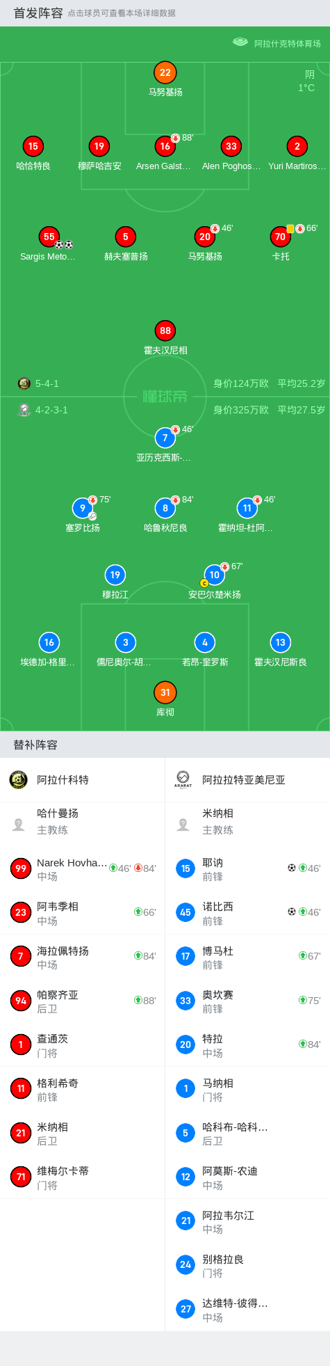 第40分钟,阿拉什科特球员Sargis Metoyan打入一球。