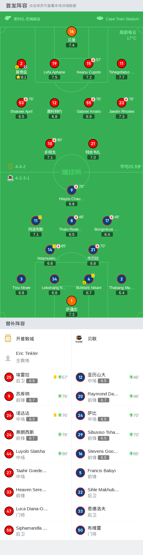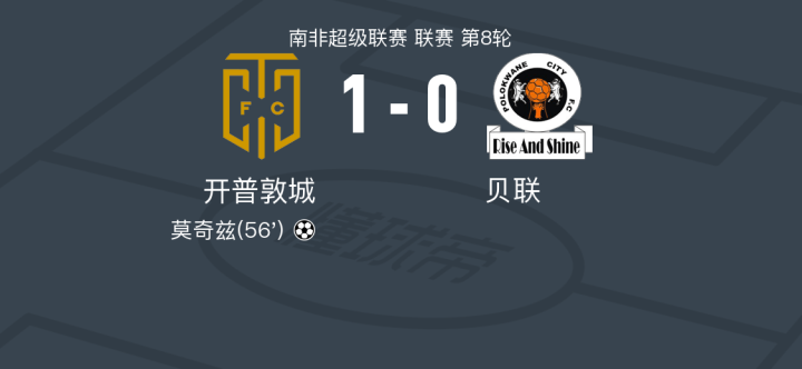 开普敦城1-0贝联,莫奇兹助球队取胜战报bot @懂球帝2024-11-28 03:22在南非超级联赛第八轮的较量中,开普敦城坐镇主场迎战贝联。比赛中,开普敦城的莫奇兹成功破门,为球队取得领先。最终,开普敦城以1-0战胜贝联,取得了本场比赛的胜利。点击查看本场比赛详细数据>>点击查看南非超完整积分榜>>精彩瞬间第56分钟,开普敦城球员莫奇兹打入一球。 球队阵容 技术统计 展开更多