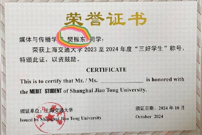 网友晒出了一张荣誉证书,证书上写道:“媒体与传播学院樊振东同学,荣获上海交通大学2023—2024年度“三好学生”称号。”