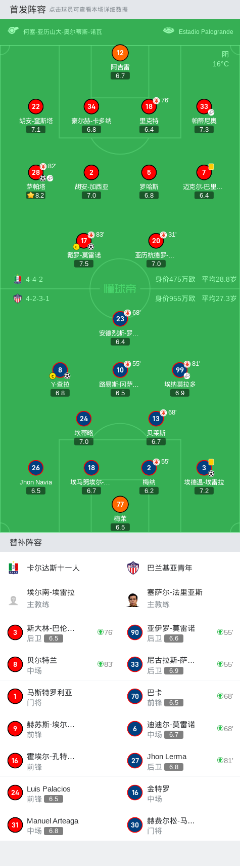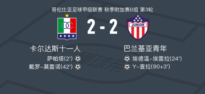 下半场补时第3分钟,巴兰基亚青年球员Y-查拉打入一球。
