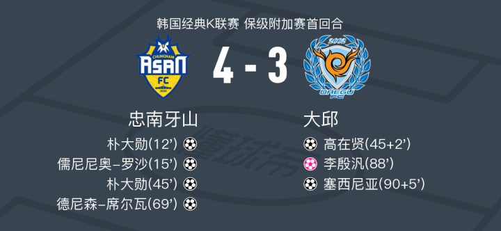 在韩国经典K联赛保级附加赛首回合中,忠南牙山坐镇主场迎战大邱。比赛中,忠南牙山的朴大勋表现出色,两次攻破对方球门,儒尼尼奥-罗沙和德尼森-席尔瓦也各自贡献一球。然而,李殷汎的一次意外失误导致自摆乌龙,为对手送上了一份大礼。大邱方面,高在贤和塞西尼亚各自取得进球,展现了顽强的反击精神。最终,经过激烈的较量,忠南牙山以4比3险胜大邱,取得了首回合的胜利。