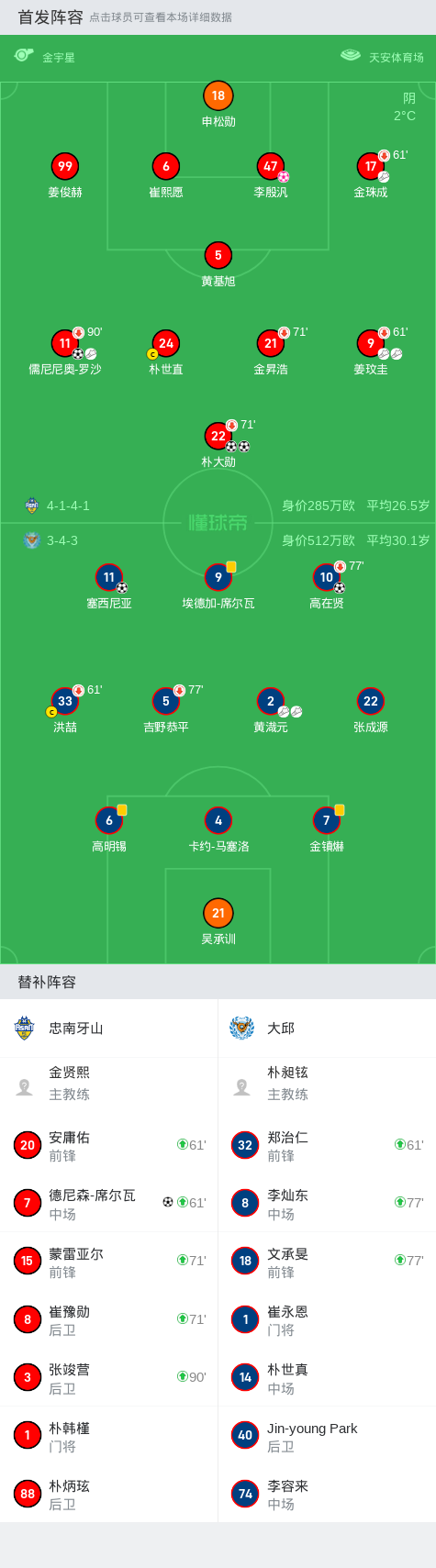第69分钟,忠南牙山球员儒尼尼奥-罗沙助攻德尼森-席尔瓦打入一球。