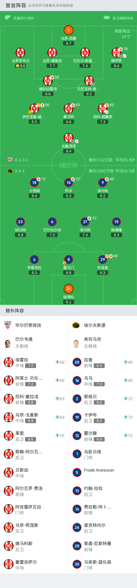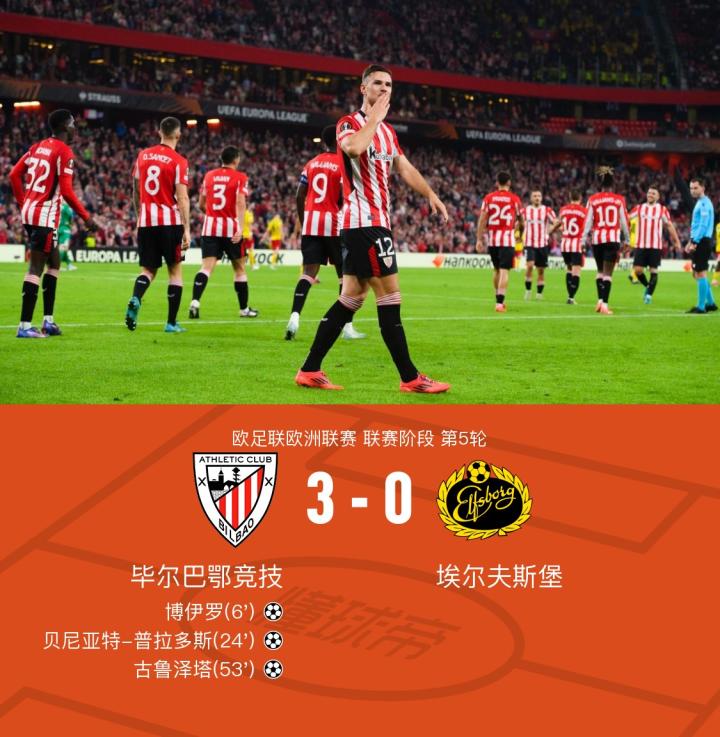 毕尔巴鄂竞技3-0埃尔夫斯堡,古鲁泽塔传射,博伊罗、贝尼亚特-普拉多斯破门