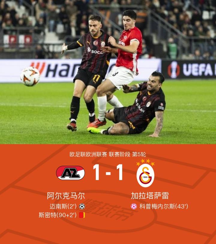 在欧足联欧洲联赛的较量中,阿尔克马尔与加拉塔萨雷展开了一场激烈的对决。比赛中,阿尔克马尔的迈南斯率先为球队取得进球,展现了出色的个人能力。然而,科普梅内尔斯的一次意外失误导致自摆乌龙,使得比分被扳平。比赛接近尾声时,阿尔克马尔的斯密特因累计两张黄牌被罚下场。最终,双方以1-1握手言和,未能分出胜负。
