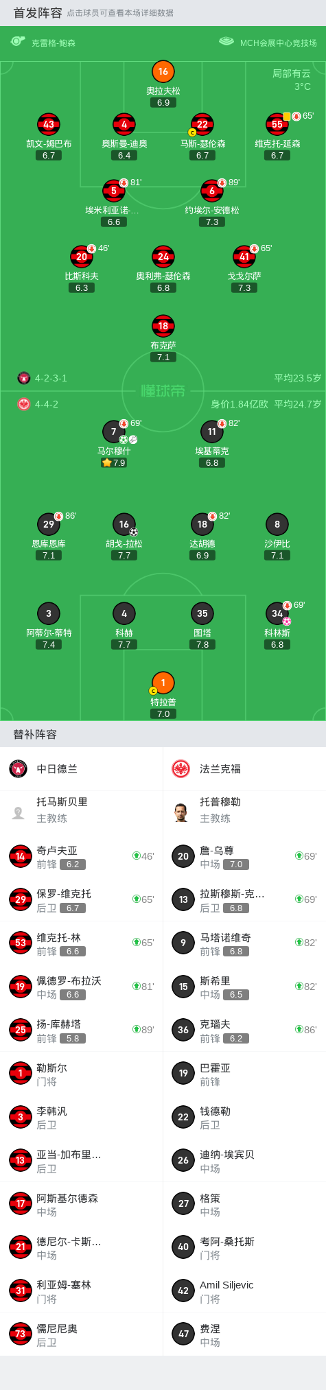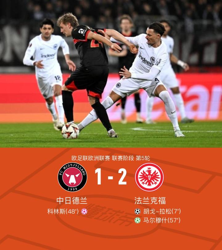 在欧足联欧洲联赛的较量中,中日德兰迎战法兰克福。比赛中,法兰克福的胡戈-拉松在马尔穆什的助攻下率先破门,为球队取得领先。随后,科林斯不慎自摆乌龙,使得中日德兰扳平比分。然而,法兰克福并未气馁,马尔穆什通过点球再次为球队取得领先。最终,法兰克福以2比1战胜中日德兰,取得了比赛的胜利。