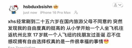 她在微博中写道:“经常刷到二十五六岁在国内旅游父母不同意的,突然发现我的自由度真的挺高的。从小学开始一个人坐飞机往返杭州北京,17岁就一个人独自飞纽约找朋友过圣诞,忍不住感叹拥有自由权真是一件很幸福的事情。”