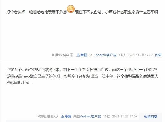 “打个老头杯,嘻嘻哈哈地玩玩不乐意,现在下不去台咯,小草包什么职业态度什么冠军啊”;