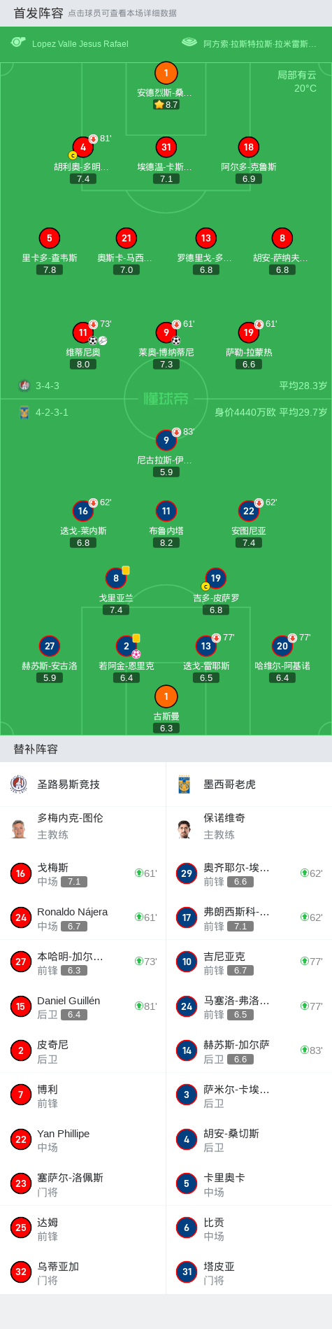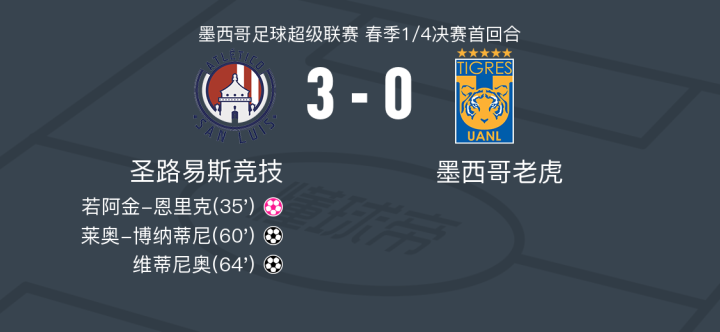 在墨西哥足球超级联赛春季1/4决赛首回合的较量中,圣路易斯竞技坐镇主场迎战墨西哥老虎。比赛中,墨西哥老虎的若阿金-恩里克不慎将球打入自家球门,为圣路易斯竞技取得领先。随后,圣路易斯竞技的维蒂尼奥展现出色的组织能力,助攻莱奥-博纳蒂尼成功破门,再下一城。紧接着,戈梅斯为维蒂尼奥送出精准传球,后者将球稳稳送入对方球网,进一步扩大比分优势。最终,圣路易斯竞技以3-0的比分完胜墨西哥老虎。