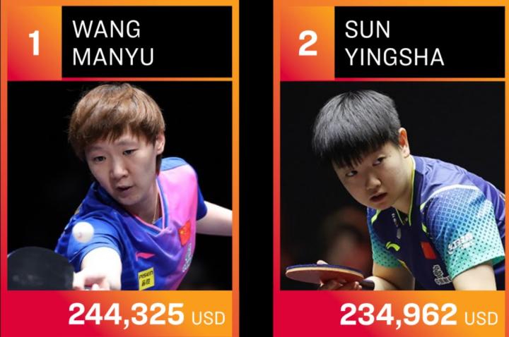 WTT年度奖金榜:王楚钦189万人民币&王曼昱177万分列男女子组榜首