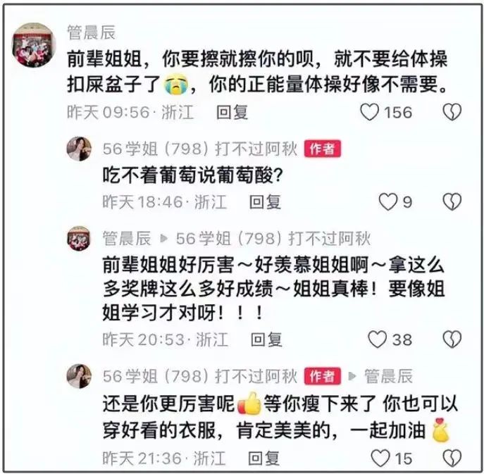 直到有一天,2020年东京奥运会女子平衡木冠军管晨辰与自己这位前辈在视频评论区里进行了“互动”。