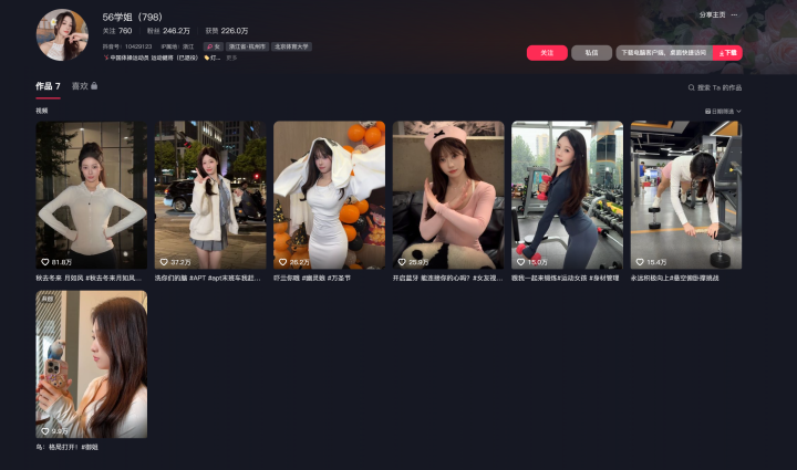 11月24日,吴柳芳隐藏或删除了自己账号下的大部分视频,此前展示的58条视频只剩下7条视频可以观看。