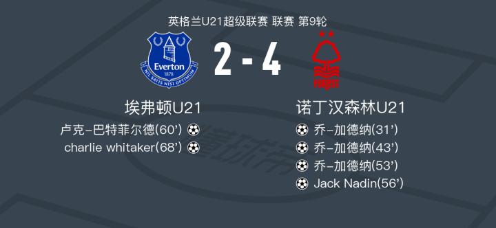 在英格兰U21超级联赛第9轮的较量中,埃弗顿U21坐镇主场迎战诺丁汉森林U21。比赛中,诺丁汉森林U21的乔-加德纳表现出色,完成了精彩的帽子戏法。比赛中,他接到jimmy sinclair、Kyle McAdam和Jack Nadin的助攻,三次攻破对方球门。此外,Jack Nadin也在Fin Back的助攻下为诺丁汉森林U21再添一分。 埃弗顿U21方面,卢克-巴特菲尔德和charlie whitaker各自为球队打入一球,展现了不俗的进攻能力。然而,尽管他们的努力为球队缩小了比分差距,但最终未能扭转局势。比赛结束时,诺丁汉森林U21以4比2的比分战胜埃弗顿U21,取得了本场比赛的胜利。