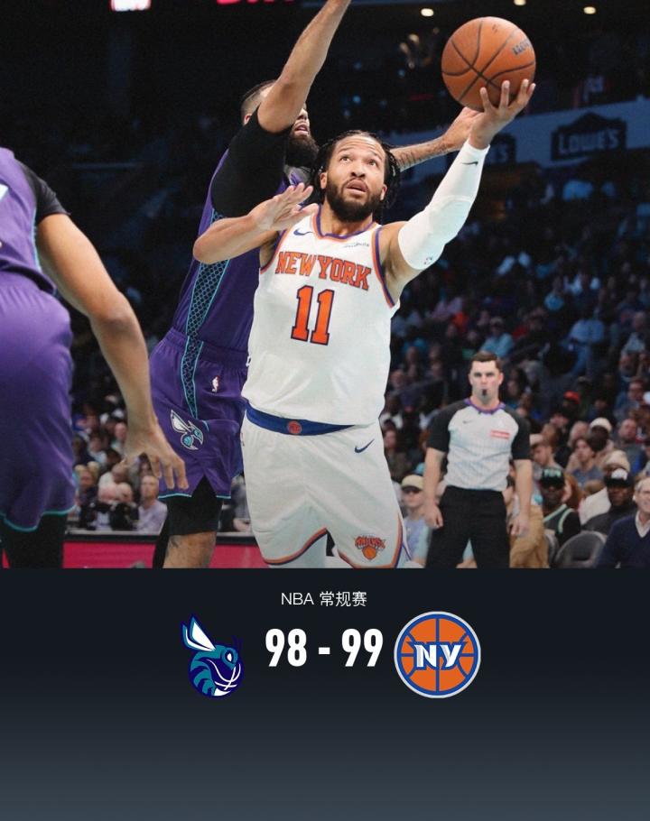 北京时间11月30日、NBA杯东部A组比赛,尼克斯99-98险胜黄蜂,杯赛取3胜0负小组第一晋级。黄蜂布兰登-米勒20分5板3助,约什-格林15分1板3助;尼克斯布伦森31分6板6助,唐斯19分12板5助。