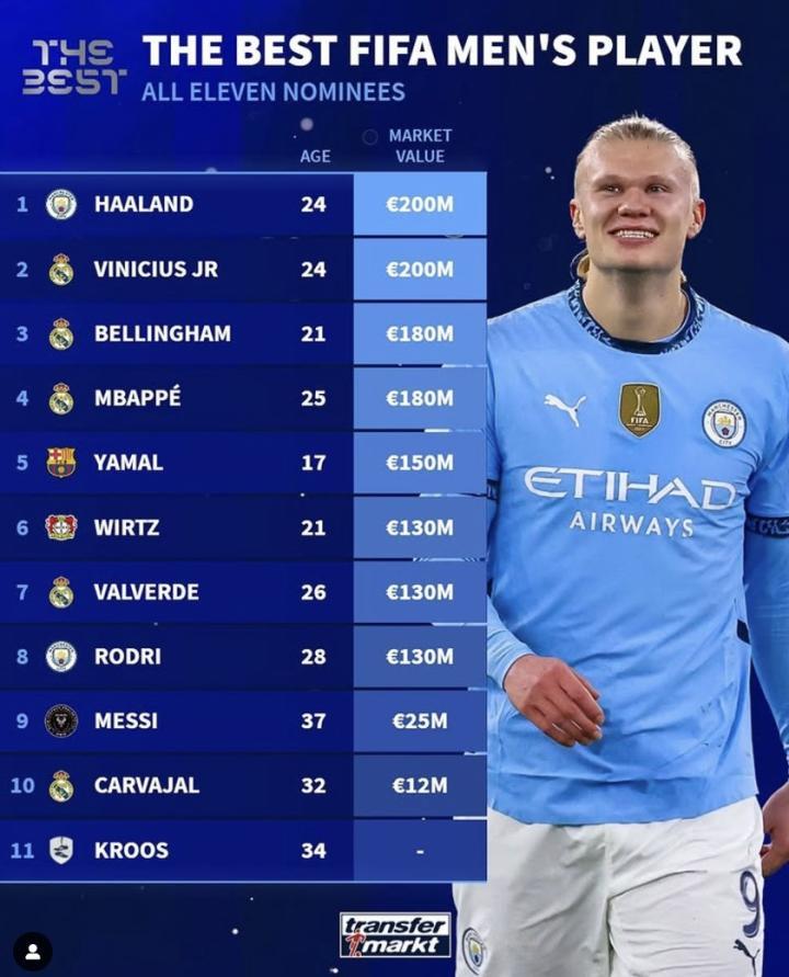 北京时间11月29日, 国际足联公布了本年度男足最佳球员的11人候选名单。随后,德国转会市场统计了入围球员的身价榜单,其中哈兰德、维尼修斯身价2亿欧,位列前二。