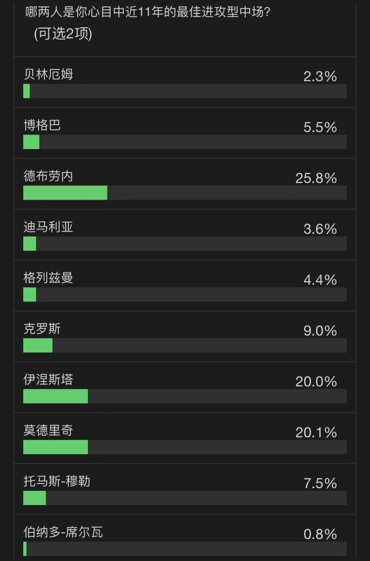 11月29日,懂球帝十一周年最佳11人评选的进攻型中场篇进行,德布劳内优势较大率先当选,而莫德里奇和伊涅斯塔的竞争在最后时刻才分出胜负。