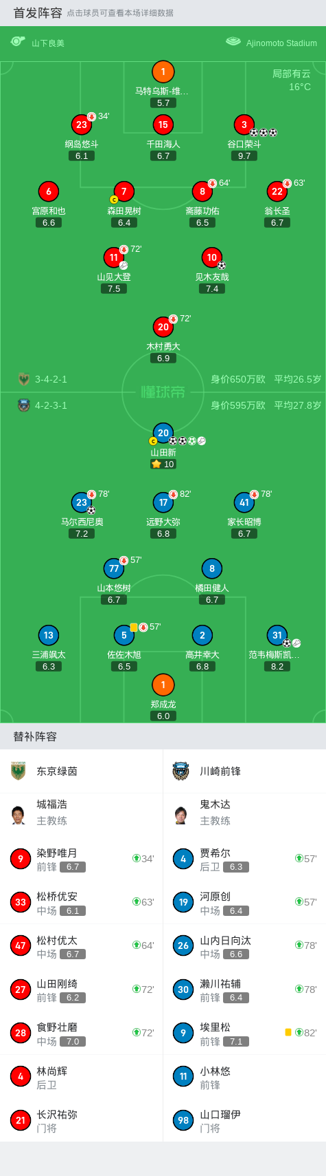 川崎前锋5-4东京绿茵,山田新帽子戏法,马尔西尼奥建功