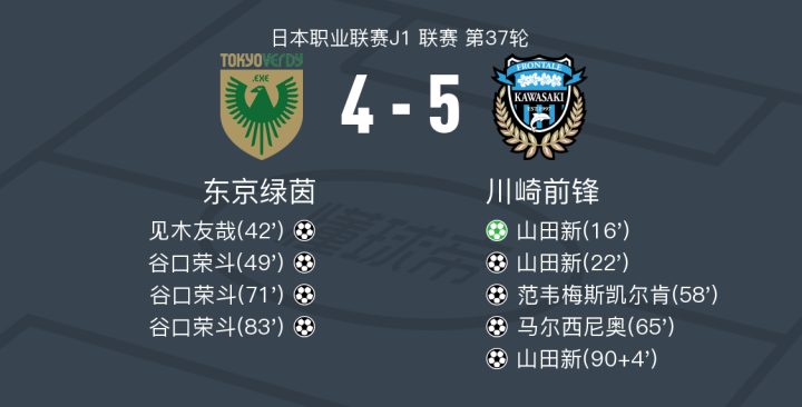 北京时间11月30日日本职业联赛J1 联赛 第37轮,东京绿茵主场对阵川崎前锋。东京绿茵见木友哉破门,谷口荣斗帽子戏法。川崎前锋山田新帽子戏法,范韦梅斯凯尔肯破门,马尔西尼奥破门。最终比分东京绿茵 4-5 川崎前锋。