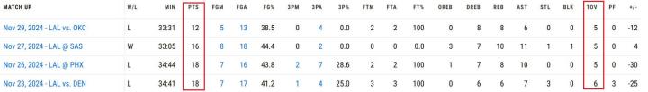 在湖人过去的4场比赛中,詹姆斯的得分都低于20分,并且每场比赛都会出现至少5次失误。