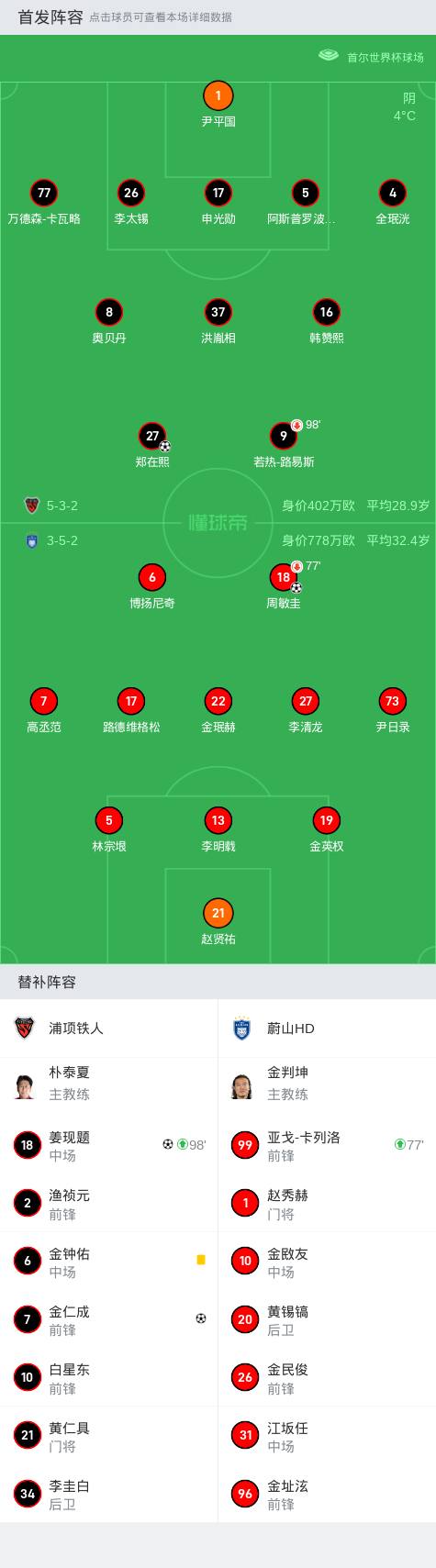 第69分钟,郑在熙内切破门将比分扳平,浦项铁人1-1