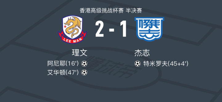 在香港高级挑战杯赛半决赛中,理文与杰志展开了一场激烈的对决。比赛中,理文的阿尼耶率先为球队取得领先。随后,杰志的特米罗夫迅速扳平比分。下半场,理文的艾华顿再度为球队建功,帮助理文锁定胜局。最终,理文以2-1战胜杰志,成功晋级决赛。