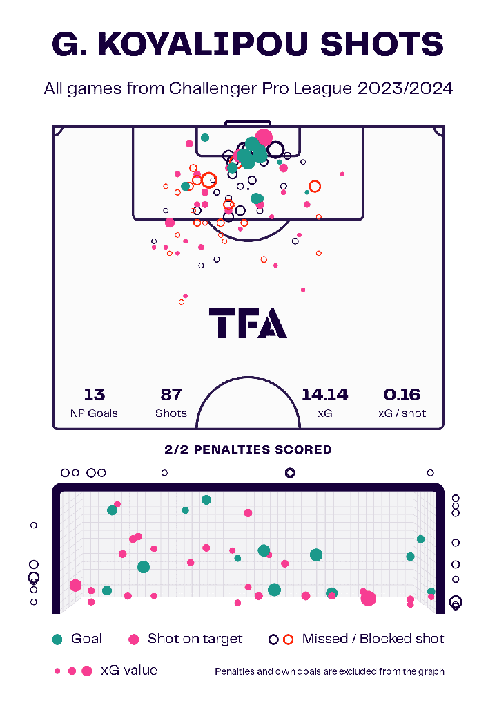 科亚利普最令人兴奋的属性无疑是他的进球能力,这位中非国脚自2023年1月以来已经打进了39粒联赛进球(法丙联赛13球,比乙联赛16球,保甲联赛10球)。科亚利普上赛季的xG也是联赛第二,我们可以看到,这位前锋的大部分射门都来自禁区内,他的大部分射门和进球都来自禁区内或禁区边缘更中心的位置。
