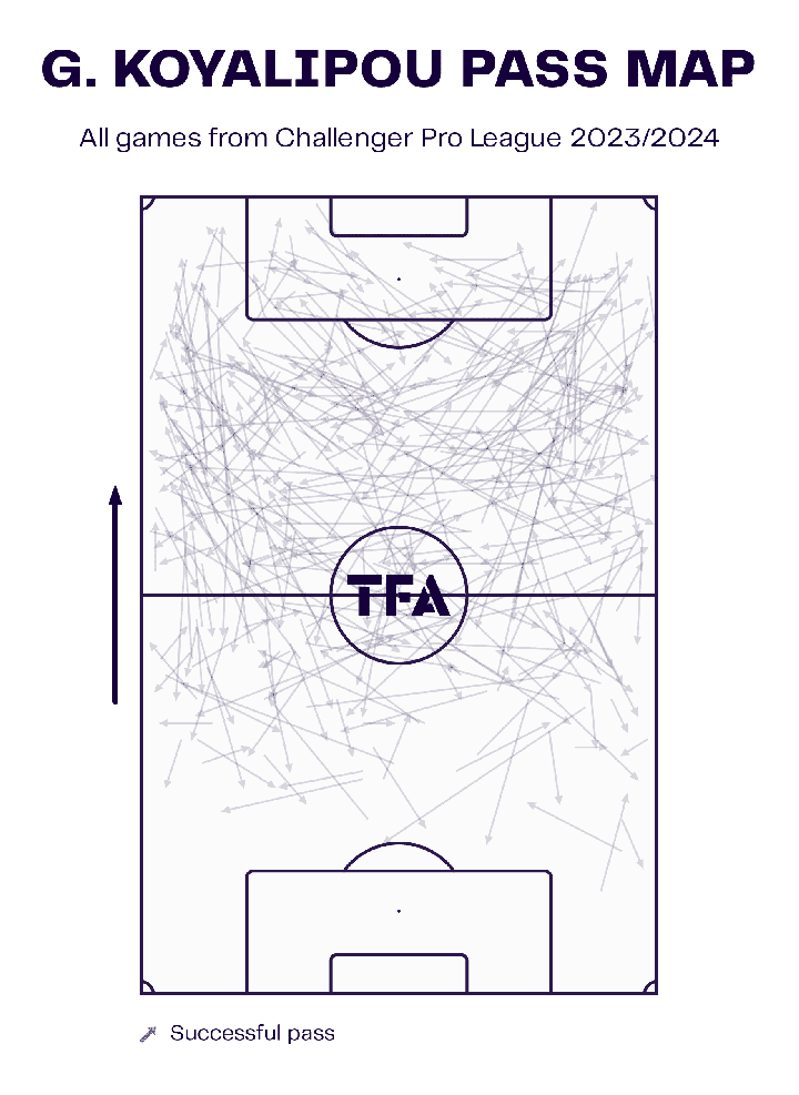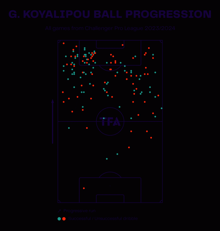 上面的数据图表更清楚地展示了科亚利普的盘带和推进能力。我们可以看到,这些推进动作大部分发生在禁区边缘附近,更具体地说是在左半空间和宽阔的场上走廊中。自己控球时,他往往会带球到这个位置,因为这让他能够以1v1方式更好面对对方的边后卫。此外,科亚利普会尝试在球场的更深区域进行盘带和推进,而不仅仅是将自己的活动范围限制在最后三分之一区域。
