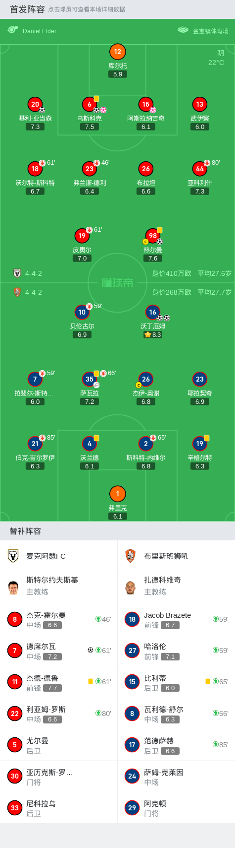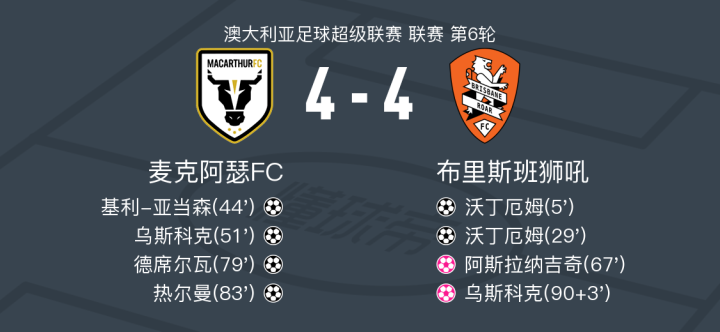 在澳大利亚足球超级联赛第6轮的比赛中,麦克阿瑟FC坐镇主场迎战布里斯班狮吼。比赛一开始,布里斯班狮吼的沃丁厄姆表现出色,率先为球队取得领先,并在队友萨瓦拉的助攻下再下一城。麦克阿瑟FC随后展开反击,基利-亚当森为球队扳回一球,紧接着乌斯科克也为主队建功,将比分扳平。 比赛进入下半场后,麦克阿瑟FC的阿斯拉纳吉奇不慎自摆乌龙,使得布里斯班狮吼再次领先。然而,麦克阿瑟FC并未气馁,杰德-德鲁接连送出助攻,帮助德席尔瓦和热尔曼各入一球,反超比分。比赛接近尾声时,乌斯科克再次出现失误,导致自摆乌龙,最终双方以4-4握手言和。