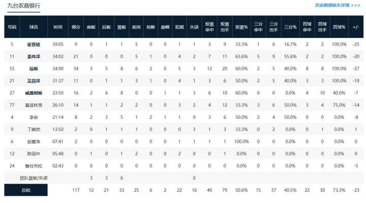 九台农商银行多米尼克-琼斯34分8板6助2断,姜伟泽21分5助1断,托马斯-基兹林克14分2板2助。