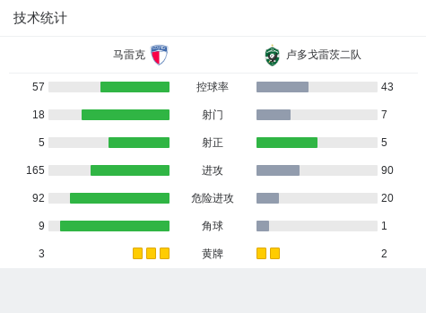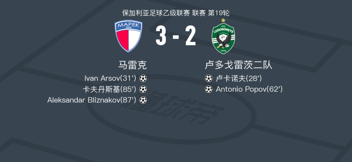 在保加利亚足球乙级联赛第19轮的较量中,马雷克坐镇主场迎战卢多戈雷茨二队。比赛中,卢多戈雷茨二队的卢卡诺夫率先为球队取得进球。随后,马雷克的Ivan Arsov迅速扳平比分。比赛进入下半场,卢多戈雷茨二队的Antonio Popov再次帮助球队取得领先。然而,马雷克展现出顽强的斗志,卡夫丹斯基和Aleksandar Bliznakov接连破门,最终帮助主队实现逆转。比赛结束,马雷克以3-2战胜卢多戈雷茨二队,取得了这场激动人心的胜利。