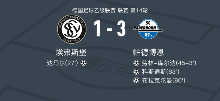 帕德博恩3-1逆转埃弗斯堡,布拉克尔曼建功,科斯通斯破门
