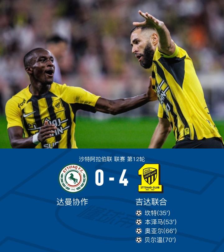 达曼协作0-4吉达联合,本泽马造3球,贝尔温传射,坎特建功
