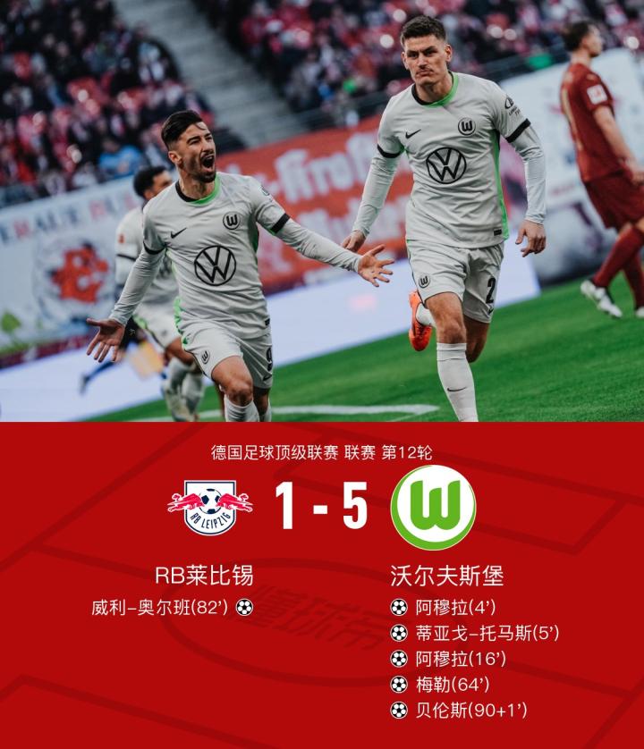 在德国足球顶级联赛第12轮的较量中,RB莱比锡坐镇主场迎战沃尔夫斯堡。比赛中,沃尔夫斯堡展现了强大的进攻火力。阿穆拉表现出色,成功梅开二度,蒂亚戈-托马斯和梅勒也各自贡献了一粒进球,贝伦斯替补建功。莱比锡方面,奥尔班为主队扳回一城。最终,莱比锡1-5惨败沃尔夫斯堡。