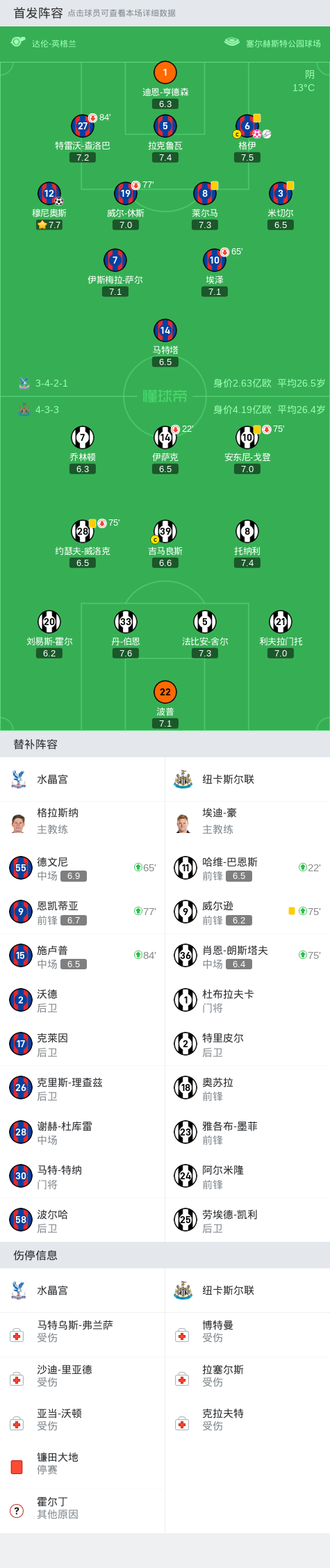 水晶宫1-1纽卡,格伊乌龙+助攻,穆尼奥斯绝平比分