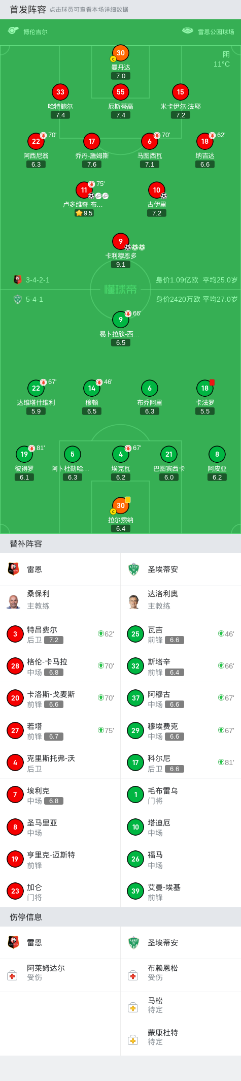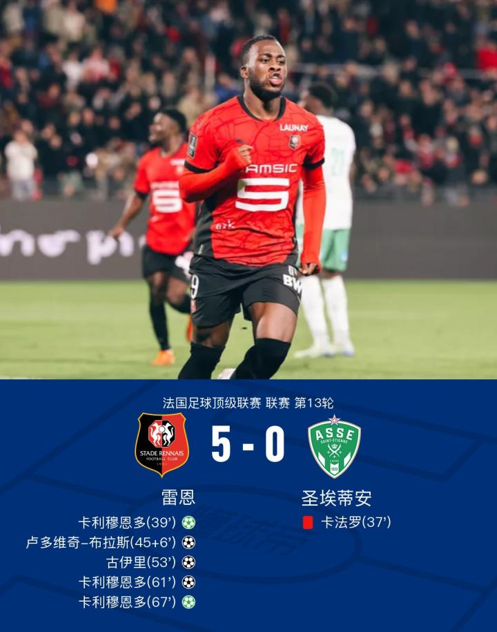雷恩5-0大胜十人圣埃蒂安,卡利穆恩多帽子戏法,卢多维奇-布拉斯传射