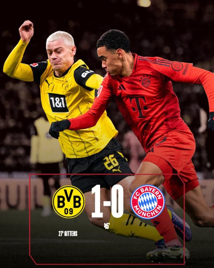 在德甲第12轮的德国国家德比中,多特蒙德在半场过后主场1-0领先于领头羊拜仁慕尼黑,比诺埃-吉滕斯开场第27分钟边路一条龙突破后破门,为多特蒙德打破场上僵局,哈里-凯恩则在第33分钟因伤被托马斯-穆勒替换下场。