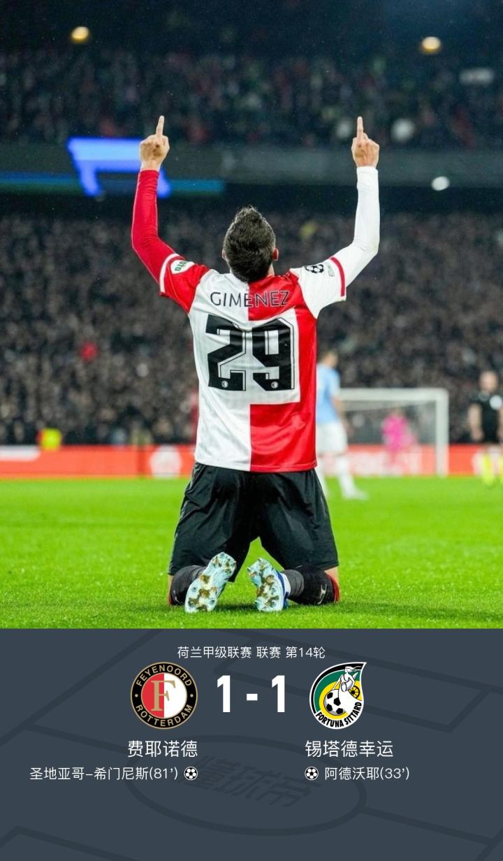 费耶诺德1-1锡塔德幸运,阿德沃耶建功,希门尼斯破门救主
