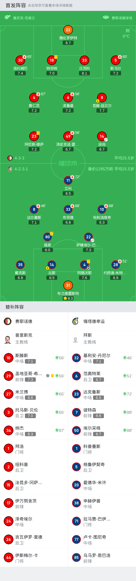 第81分钟,费耶诺德球员派尚助攻圣地亚哥-希门尼斯打入一球。