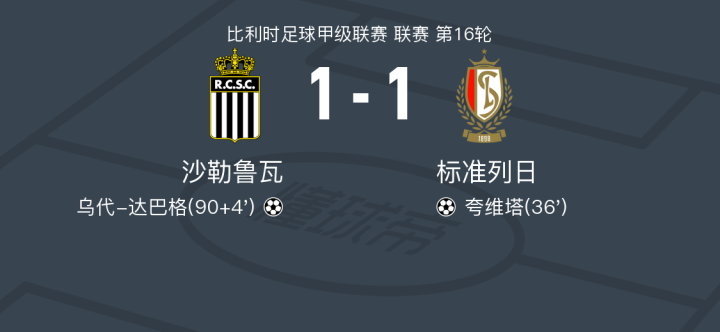 在比利时足球甲级联赛第16轮的较量中,沙勒鲁瓦坐镇主场迎战标准列日。比赛中,标准列日的夸维塔率先为球队取得进球。随后,沙勒鲁瓦的乌代-达巴格也为主队扳平比分。最终,双方以1-1握手言和。