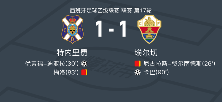在西班牙足球乙级联赛第17轮的较量中,特内里费坐镇主场迎战埃尔切。比赛中,特内里费的路易斯米-克鲁斯送出精妙助攻,优素福-迪亚拉成功破门,为主队取得领先。然而,埃尔切并未轻易放弃,比赛接近尾声时,比加斯助攻卡巴,帮助客队扳平比分。最终,双方以1-1握手言和,各取一分。比赛中,双方各有一名球员因累计黄牌被罚下,比赛的激烈程度可见一斑。