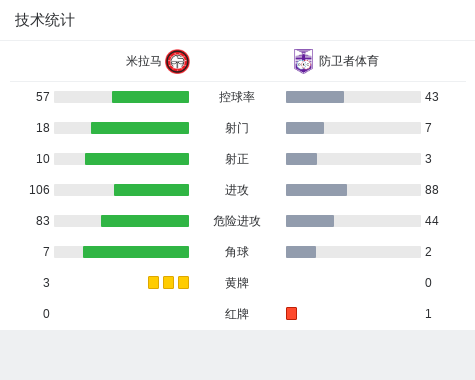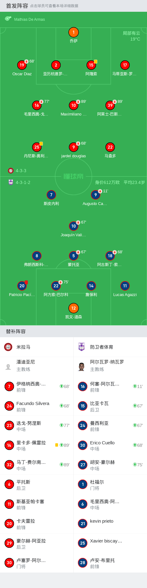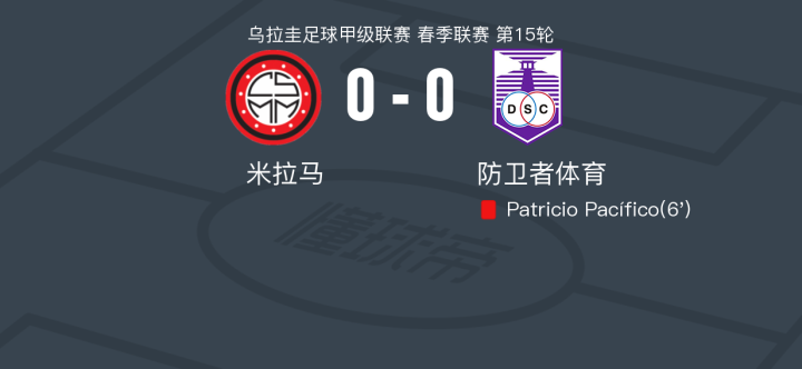 在乌拉圭足球甲级联赛春季联赛第15轮的较量中,米拉马坐镇主场迎战防卫者体育。比赛中,防卫者体育的Patricio Pacífico因犯规被罚下场,给球队带来了不小的挑战。尽管如此,双方在场上都展现了顽强的斗志和出色的防守能力,最终以0-0的比分握手言和。