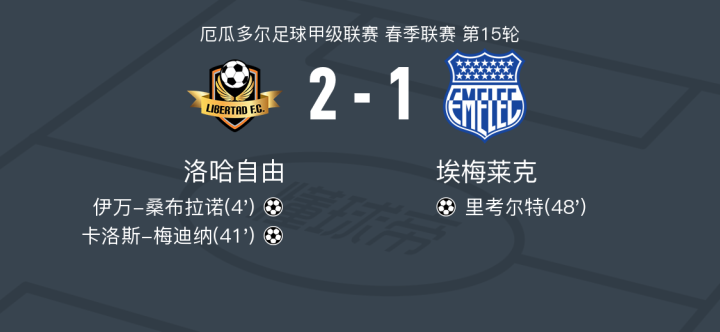 在厄瓜多尔足球甲级联赛春季联赛第15轮的较量中,洛哈自由坐镇主场迎战埃梅莱克。比赛中,洛哈自由的伊万-桑布拉诺率先为球队打开局面,随后卡洛斯-梅迪纳再下一城,扩大了领先优势。埃梅莱克的里考尔特则为客队扳回一球。最终,洛哈自由以2-1战胜埃梅莱克,取得了本场比赛的胜利。