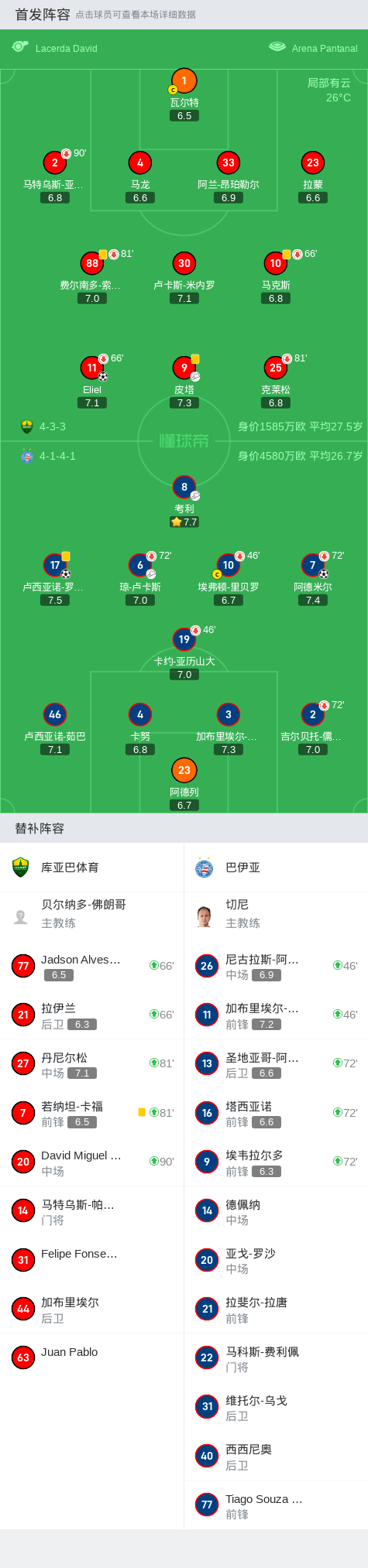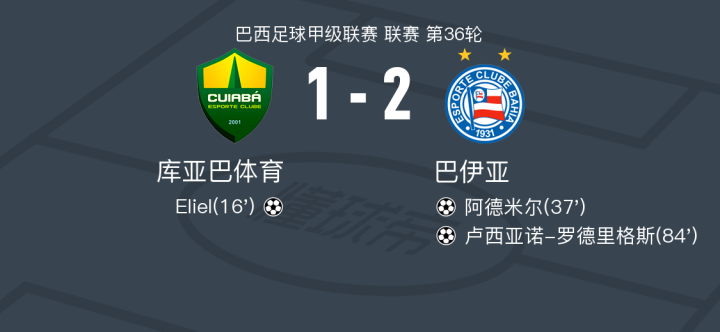 在巴西足球甲级联赛第36轮的较量中,库亚巴体育坐镇主场迎战巴伊亚。比赛中,库亚巴体育的Eliel率先为球队取得进球。随后,巴伊亚的阿德米尔扳平比分。比赛接近尾声时,卢西亚诺-罗德里格斯为巴伊亚打入制胜一球。最终,巴伊亚以2比1的比分逆转战胜库亚巴体育。