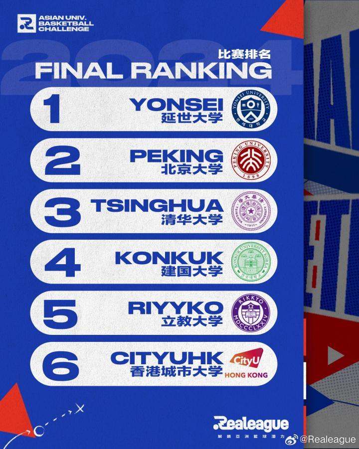 由Realeague主办的香港亚洲大学生篮球邀请赛于11月28日至12月1日在香港中山纪念公园体育馆举行,该赛事汇集了来自中国的清华大学、北京大学、香港城市大学以及来自韩国的延世大学、建国大学和来自日本的立教大学。