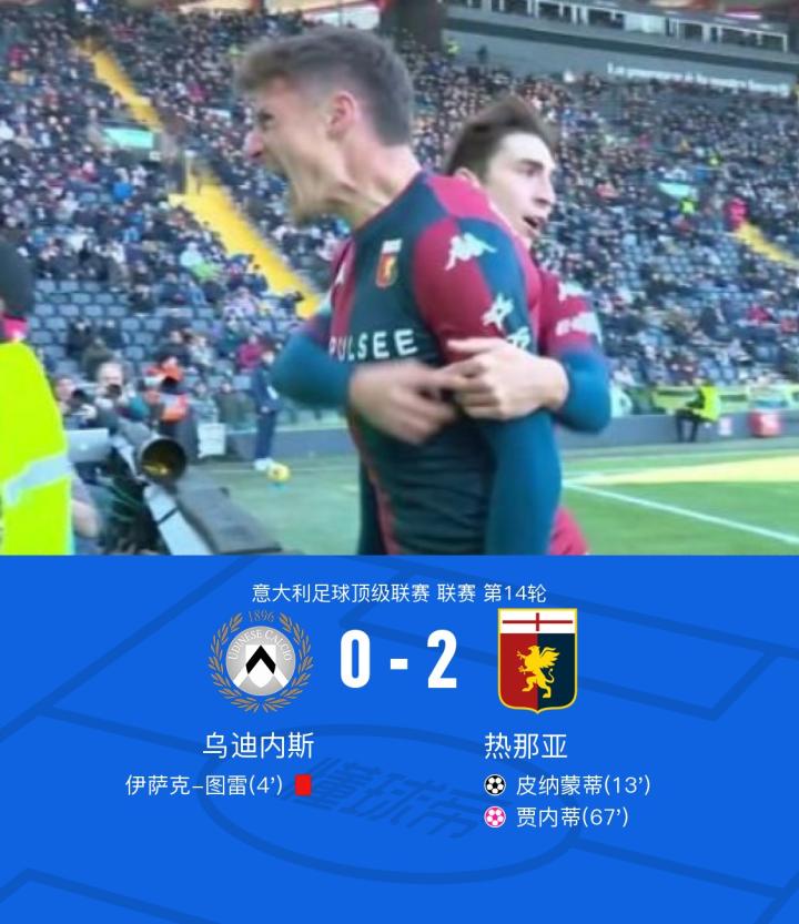热那亚2-0十人乌迪内斯,皮纳蒙蒂破门,贾内蒂乌龙