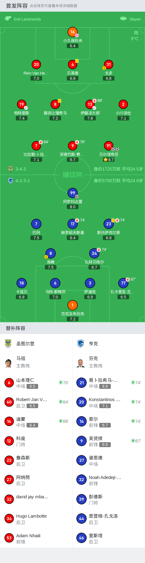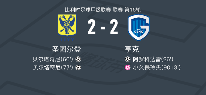 在比利时足球甲级联赛第16轮的较量中,圣图尔登坐镇主场迎战亨克。比赛中,亨克的阿罗科达雷率先为球队取得领先。随后,圣图尔登的贝尔塔奇尼表现出色,接连打入两球,帮助球队反超比分。比赛接近尾声时,圣图尔登的小久保玲央不慎自摆乌龙,最终双方以2-2握手言和。