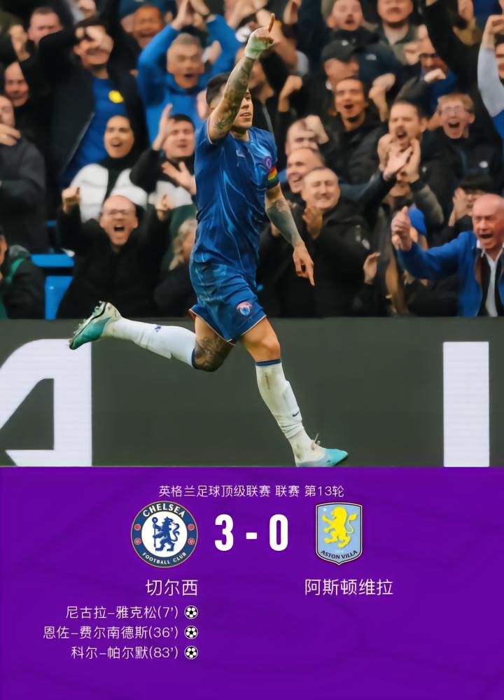 在英格兰足球顶级联赛第13轮的比赛中,切尔西坐镇主场迎战阿斯顿维拉。上半场库库雷利亚抢断随后横传,雅克松抢点撞柱破门,之后帕尔默助攻,恩佐停球后顺势外脚背凌空破门。下半场尾声马杜埃凯助攻,帕尔默内切远射破门。最终,切尔西3-0送阿斯顿维拉各项赛事8场不胜。